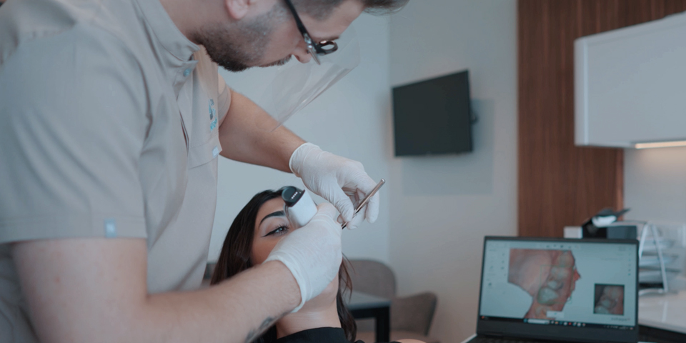 Digital dentistry makes dental treatment processes faster, more precise, and more effective compared to traditional methods with the help of modern technologies. Digital dentistry minimizes the use of traditional impression trays and materials, aiming to enhance patient comfort during the treatment process and prevent human errors. With this method, numerous dental procedures can be performed, including small fillings, intra-crown restorations (inlays, onlays), overlays and veneers, all types of prosthetic restorations, orthodontic treatments, and implant treatments. The most important component of the system for the dental clinic is intraoral scanners. In our clinic, we use the latest model of the 3 Shape brand, which has proven its reliability, known as TRIOS5, from CAD/CAM (Computer-aided Design/Computer-aided Manufacturing) systems. With this technology, patients' treatments can be completed in just one day.